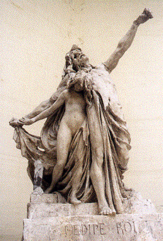 "Ecoute attentivement" dit le Sphinx: "Le matin, il a une tête et quatre jambes. A midi il n'en a plus que deux. Et le soir il en a trois. Plus il a de jambes moins il a de forces." Oedipe répondit: "C'est l'homme. Au matin de sa vie il marche à quatre pattes, à midi il est adulte et le soir il doit s'aider d'un bâton pour marcher."