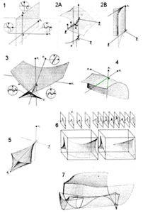 il y en a sept pour les équations à quatre paramètres au plus dont les solutions peuvent être représentées par des surfaces : le pli (1), la fronce (2), la queue d'aronde (3), la vague (ombilic hyperbolique, 4), le poil (ou ombilic elliptique, 5), le papillon (6) et le champignon (ombilic parabolique, 7).